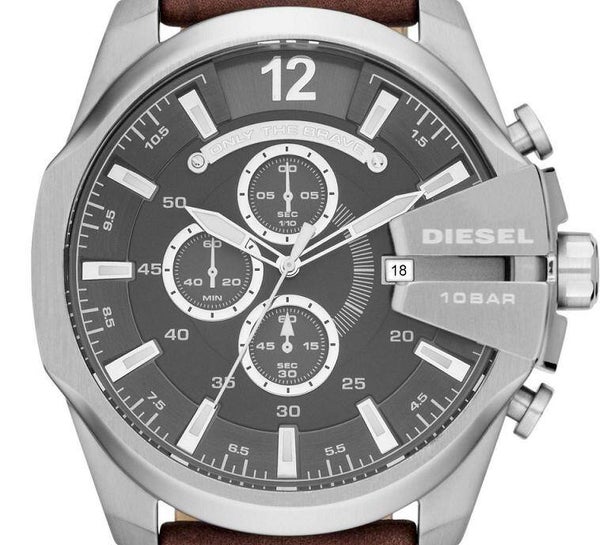 DZ4290 Megachief horloge. Robuust en trendy herenhorloge van het merk Diesel. XXL formaat (51mm). Het horloge heeft een analoge display met een chronografisch uurwerk en datumweergave. De kleurstelling is zwart met een bruinleren band, wat het geheel een uitgesproken modieuze en sportieve uitstraling geeft. De kast is van staal. Het horloge is 10ATM waterbestendig.